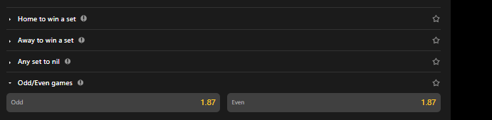 - Odd bet wins if the number of games played during the match is an odd number(1,3,5...)