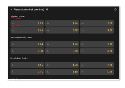 The market is the prediction the total number of tackles for a certain player. Overtime included. Bets on non-starters will be voided.